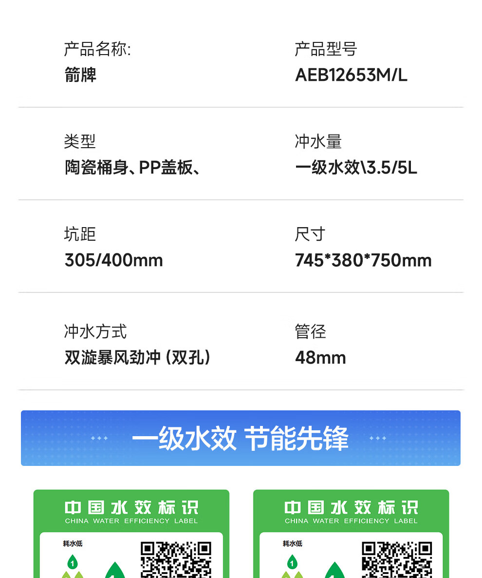 箭牌(ARROW)马桶家用直冲式坐便器大冲力座便坐厕1级水效AEB12601-1M 305坑距