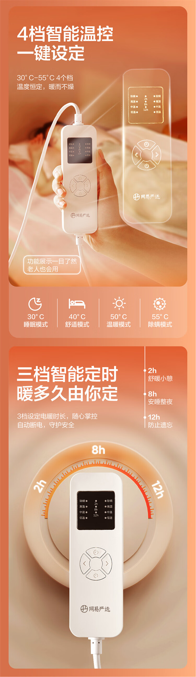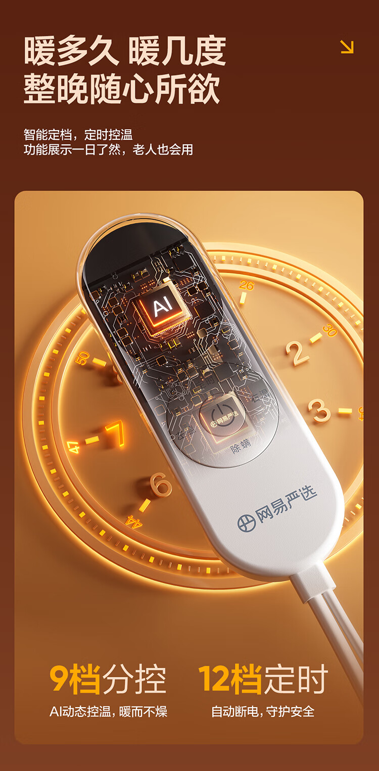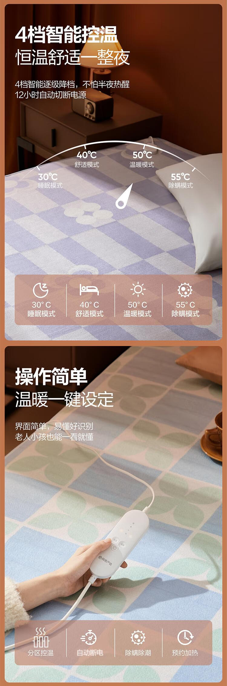 网易严选 电热毯抗菌双人电褥子双温双控除螨除湿自动断电家用电暖毯子 【双区控温】印花绿色 200cm*180cm