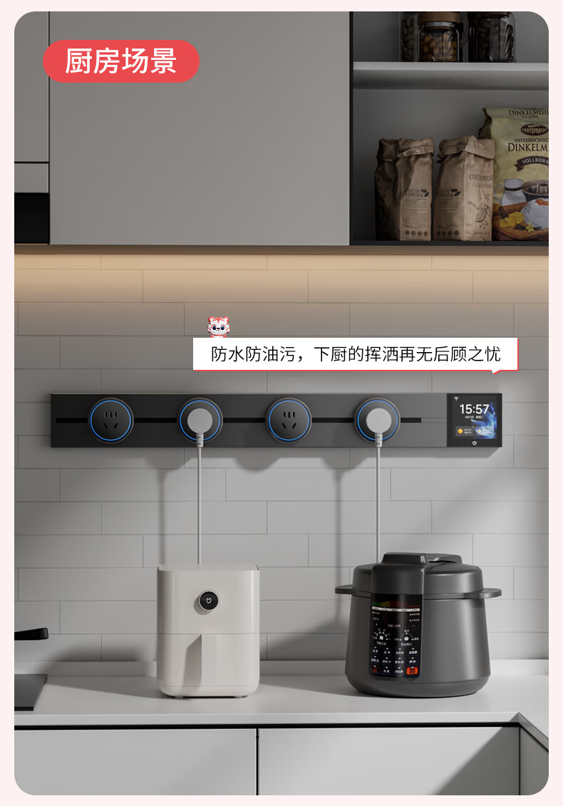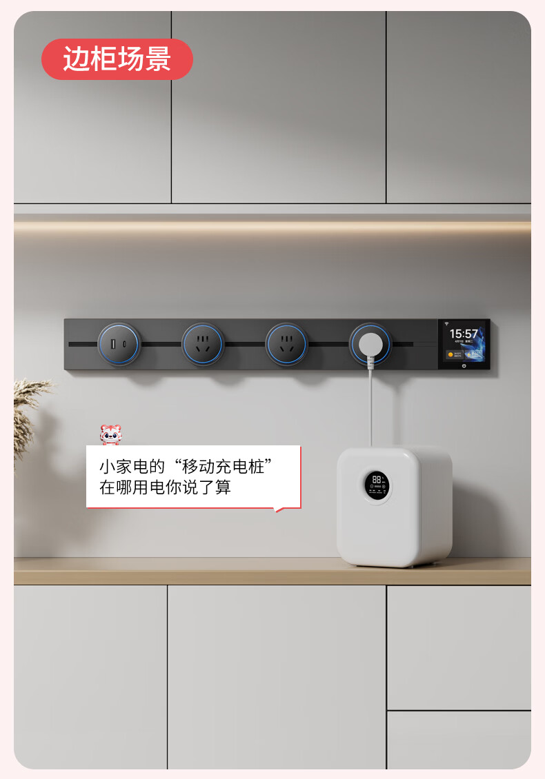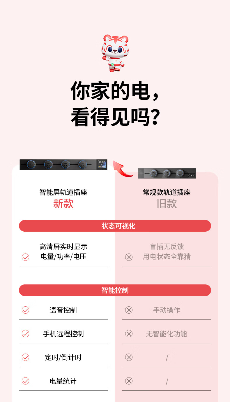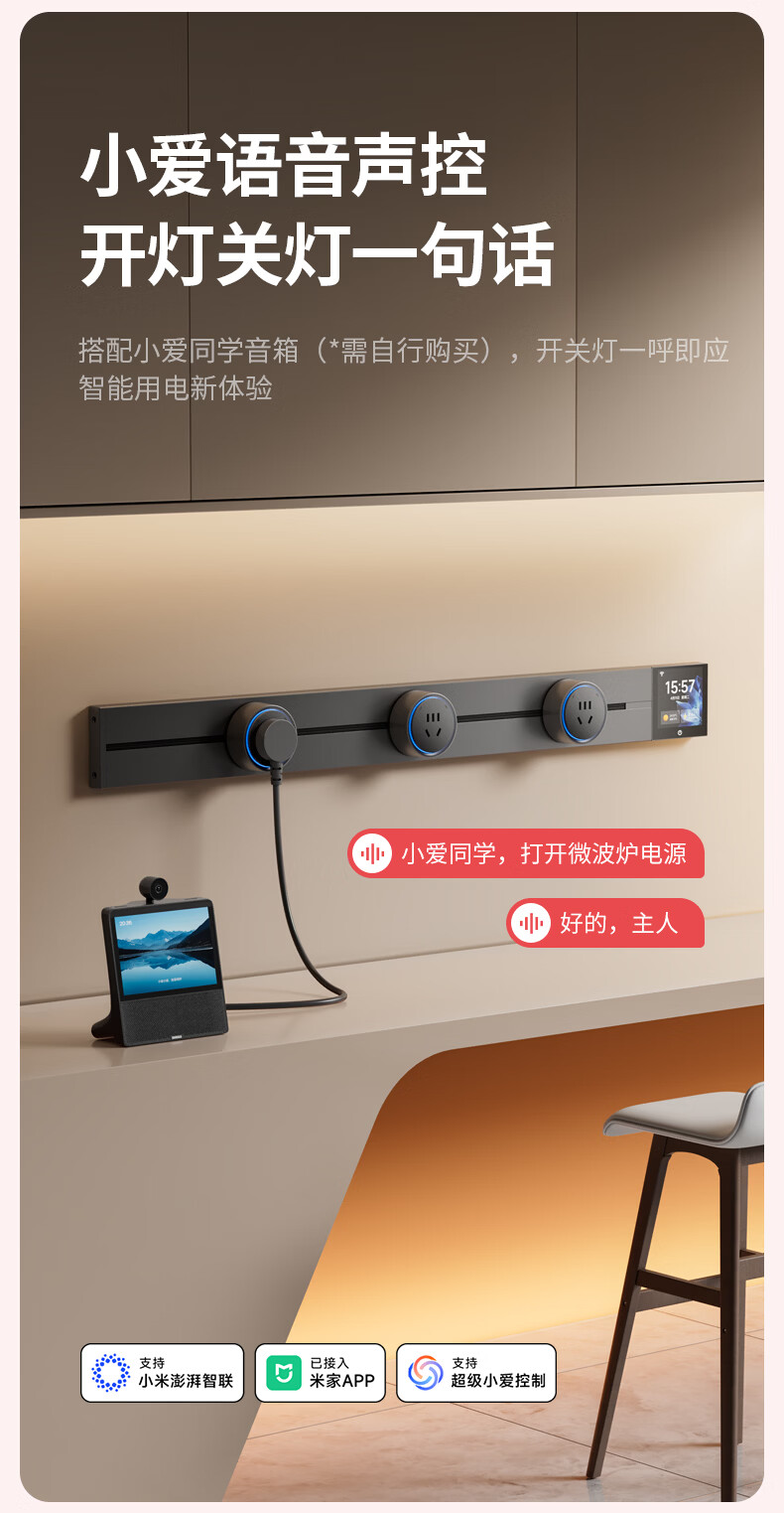 国际电工智能轨道式插座数显屏大功率过载保护移动语音远程已接入米家APP 支持小爱同学控制【高级黑】 智能屏轨道 60cm +4个五孔+1个USB