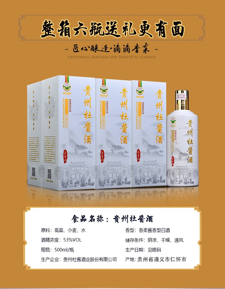 杜酱酒 茅台镇53度香柔酱香型白酒 纯粮食酒 窖藏陈酿老酒 53度 500mL 6瓶 整箱装+礼袋