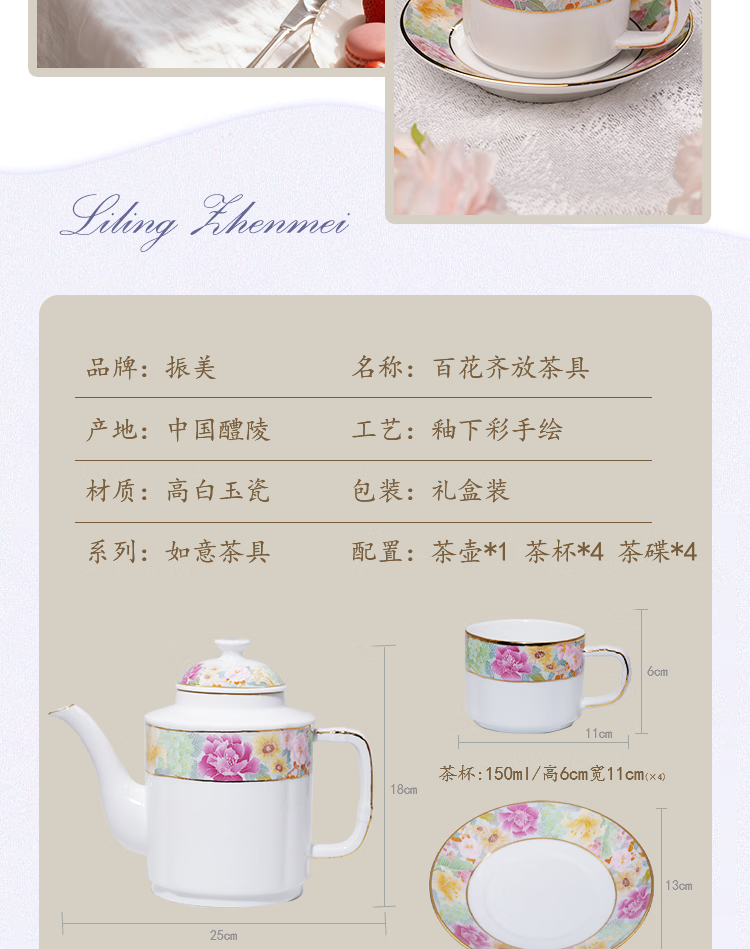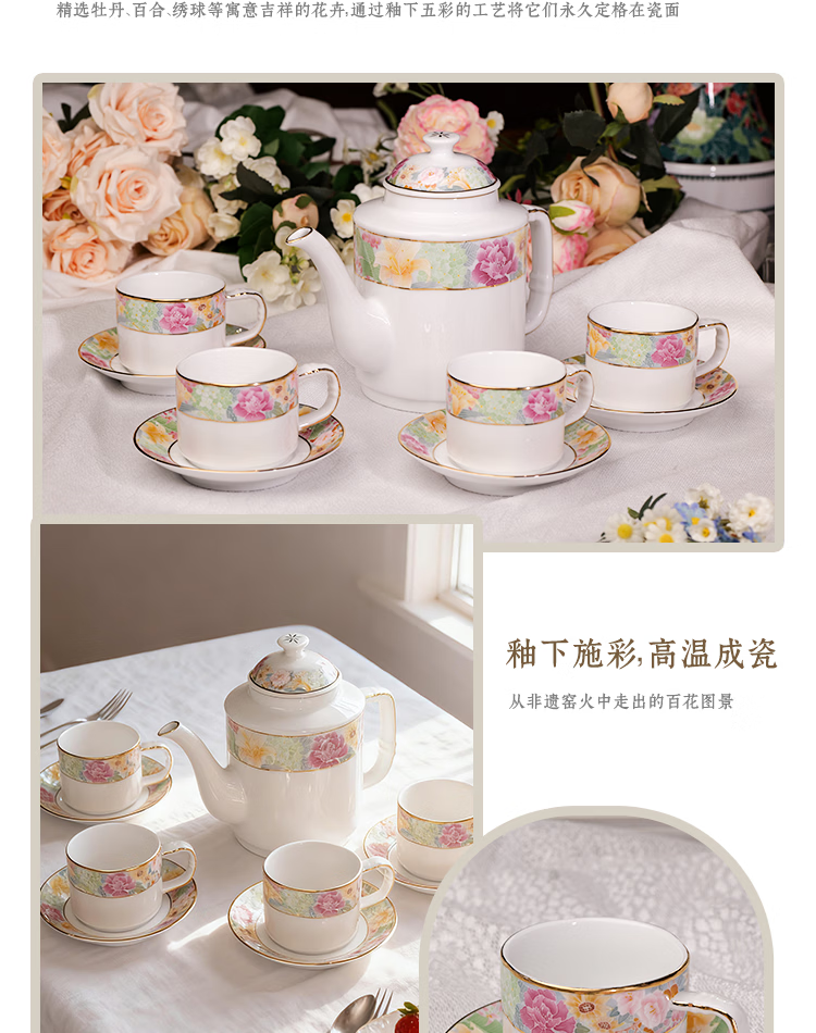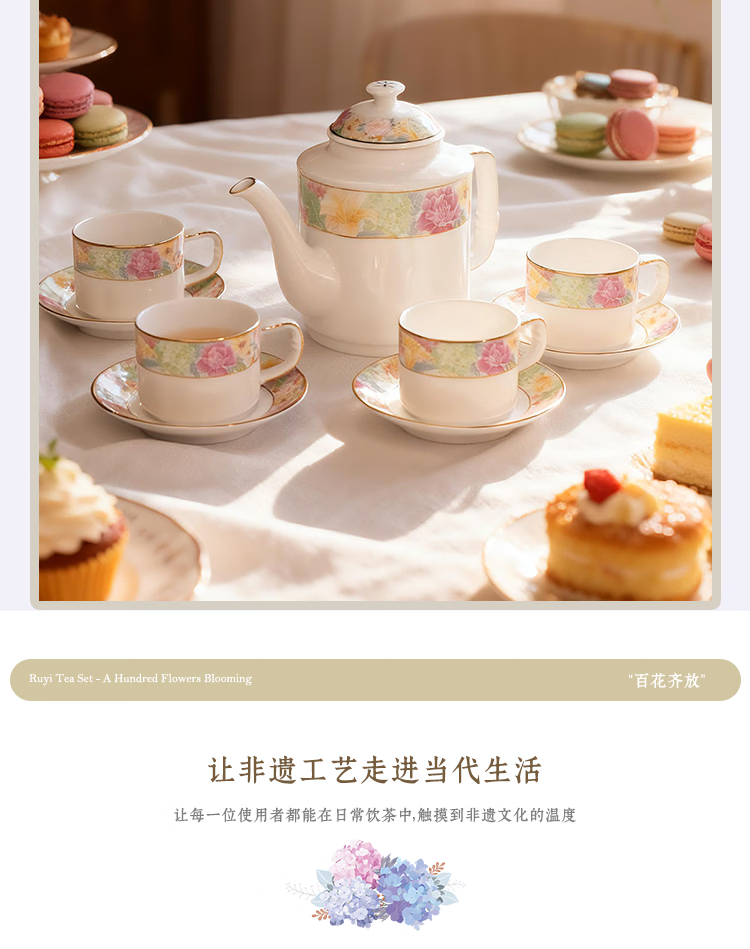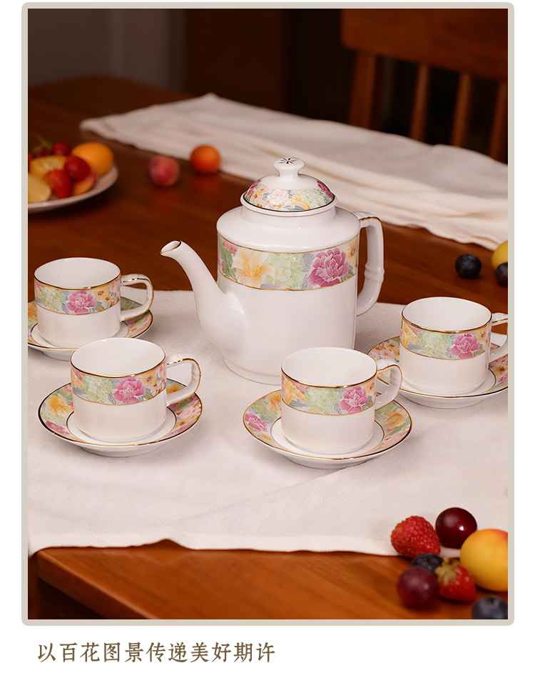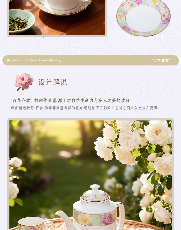 振美如意系列百花齐放茶具 国瓷套装家用陶瓷 新中式茶壶茶杯整套礼物 百花齐放茶具套装