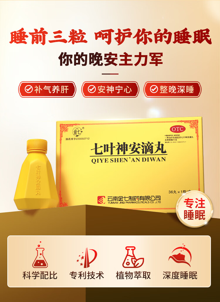 [金七]七叶神安滴丸 50mg*36丸 1盒装 大药房 舒肝气清肝火补肝虚治失眠多梦易醒养心安神头晕目眩正品云南治疗失眠 调节入睡时间