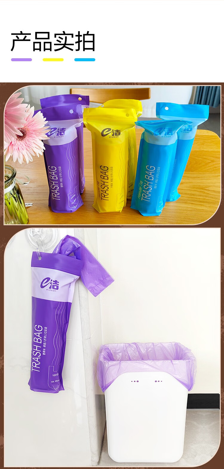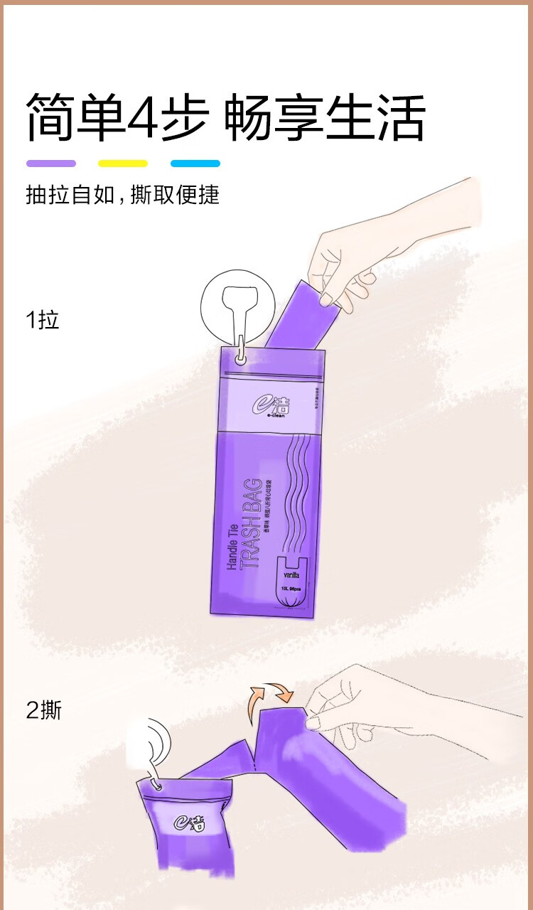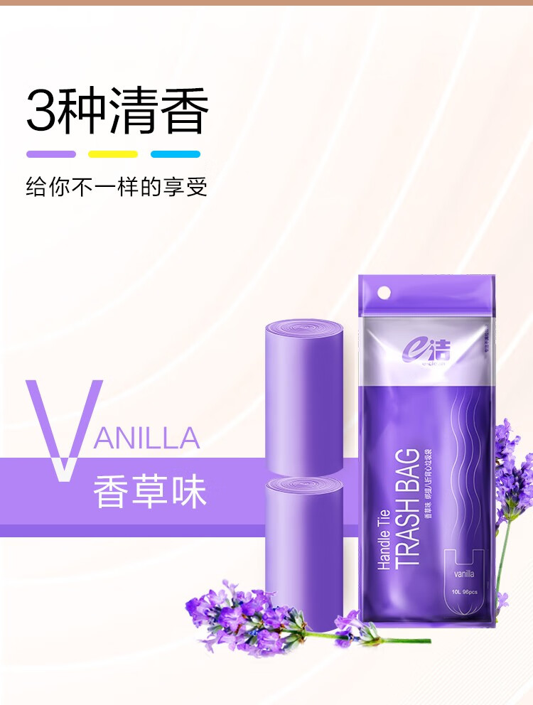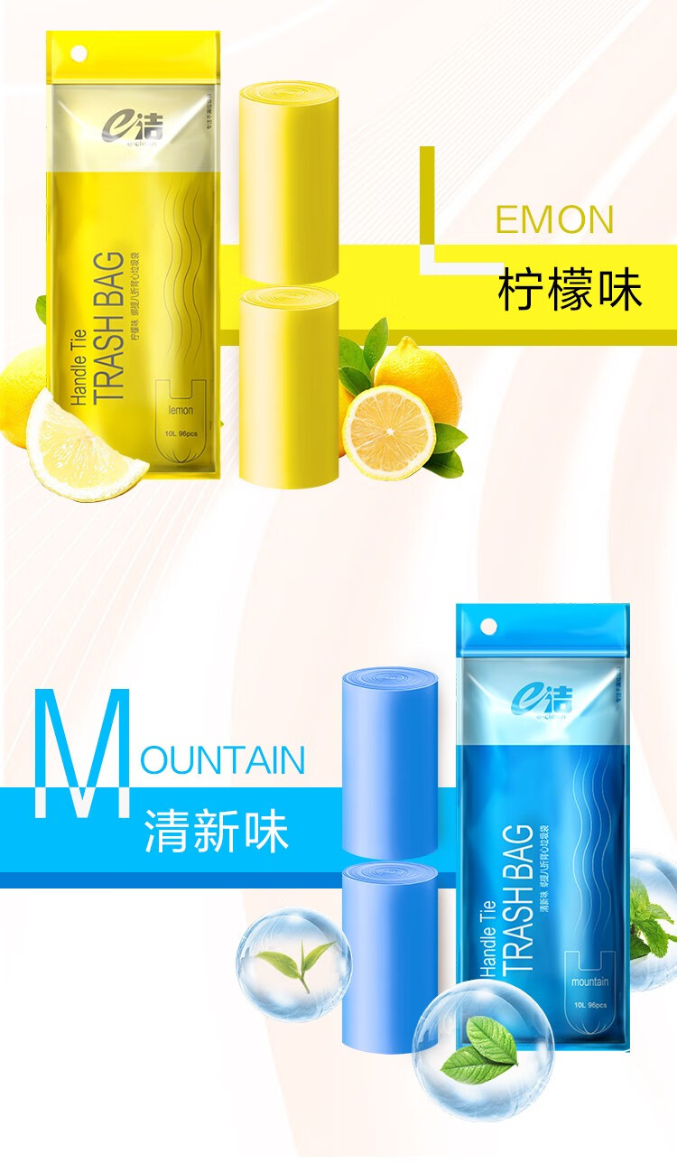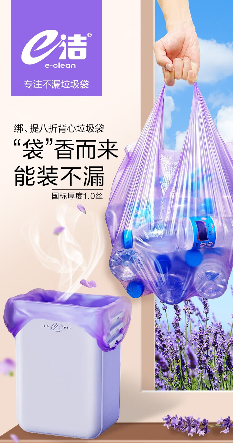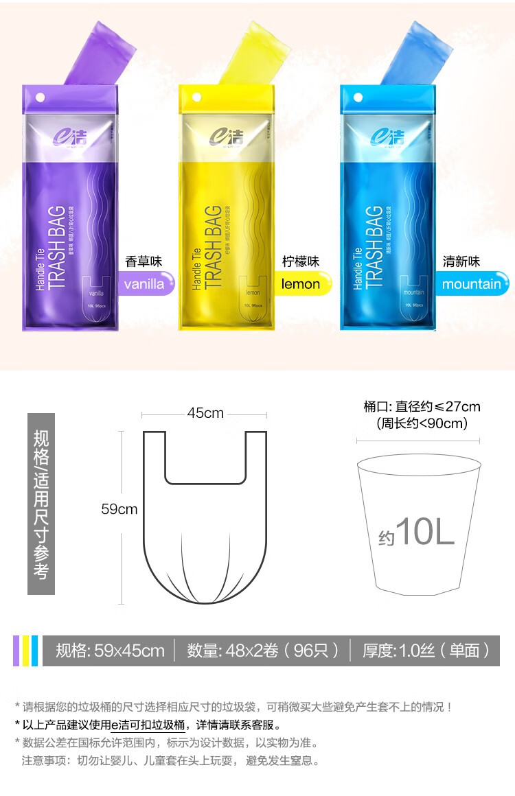 e洁绑提式背心垃圾袋手提式香味可绑可提家用厨房酒店用塑料袋 108只 10L 双面2丝厚度 45x59cm