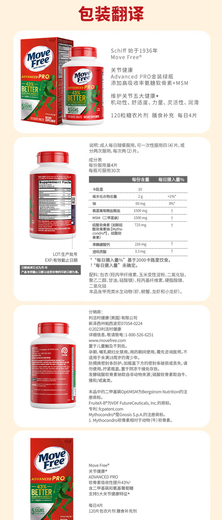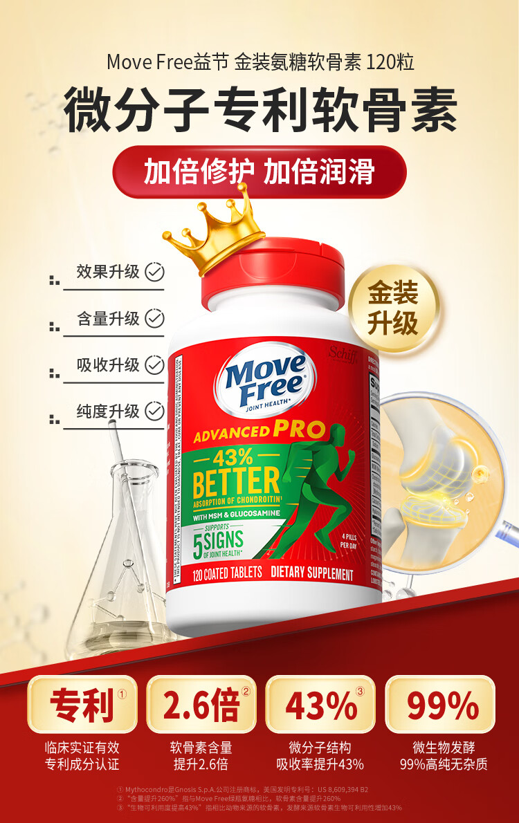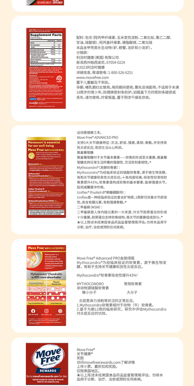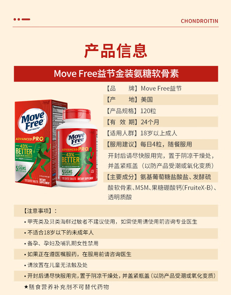 Move Free益节 金装氨糖软骨素 钙片 120粒 维骨力 成人中老年 美国进口