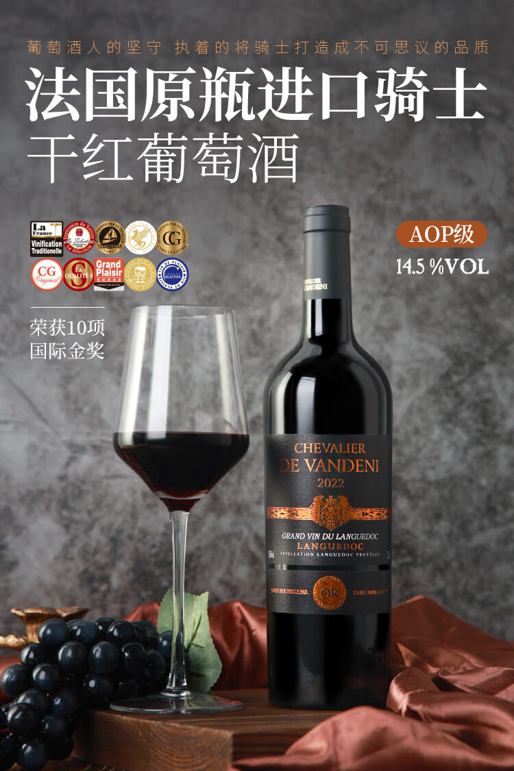 凡登尼【国际10项金奖】法国原瓶进口红酒整箱 AOP级干红葡萄酒送礼盒装 【高端骑士14.5度】750ml*6瓶