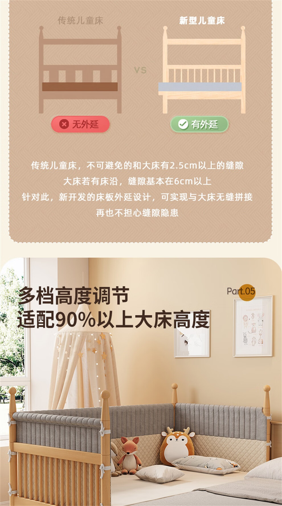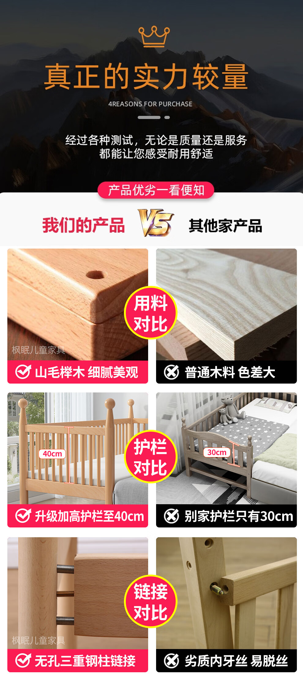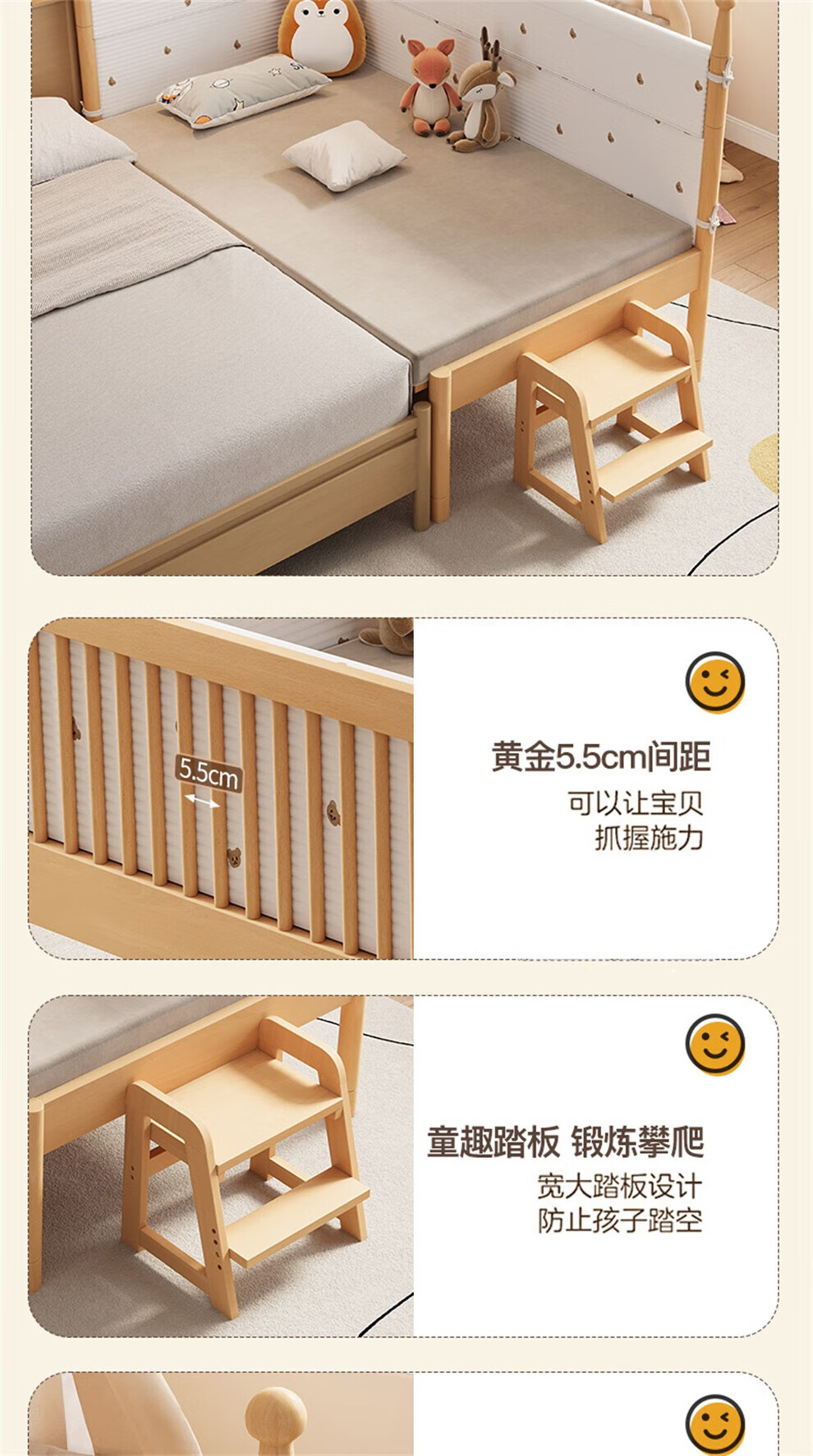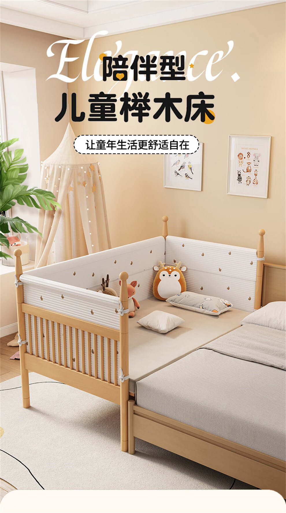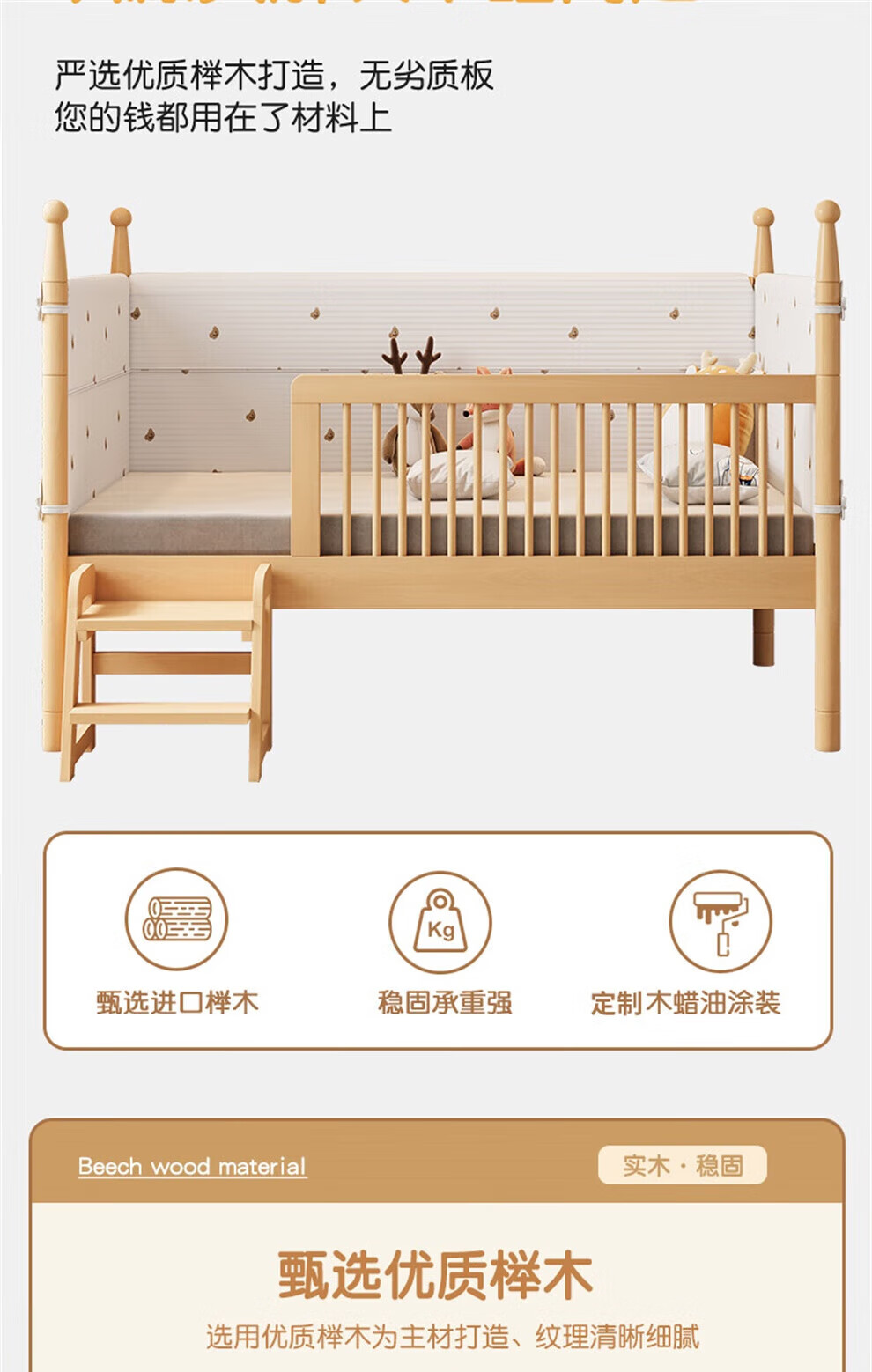 枫眠 儿童床拼接床婴儿床带护栏边床婴幼儿床男女孩床 进口榉木 床+小熊床围+5cm椰棕床垫 180cm*60cm(外径)