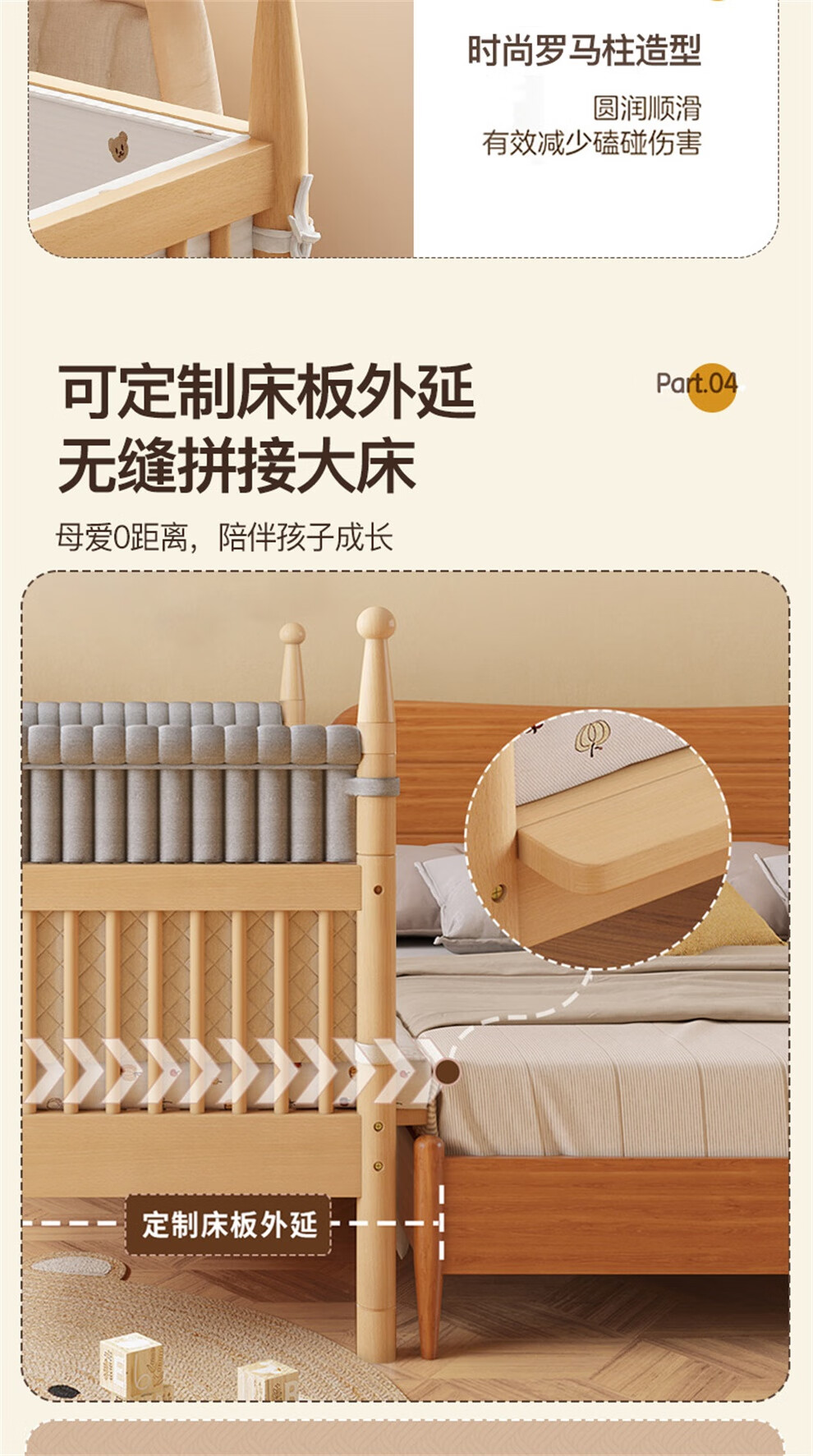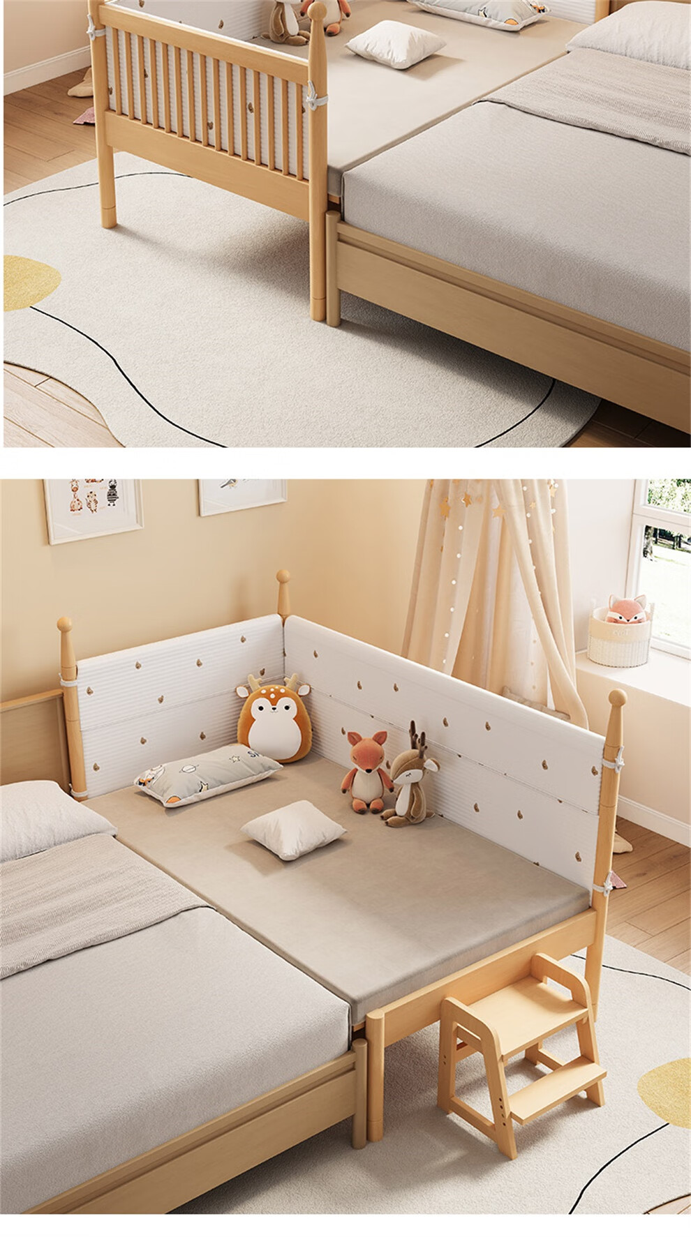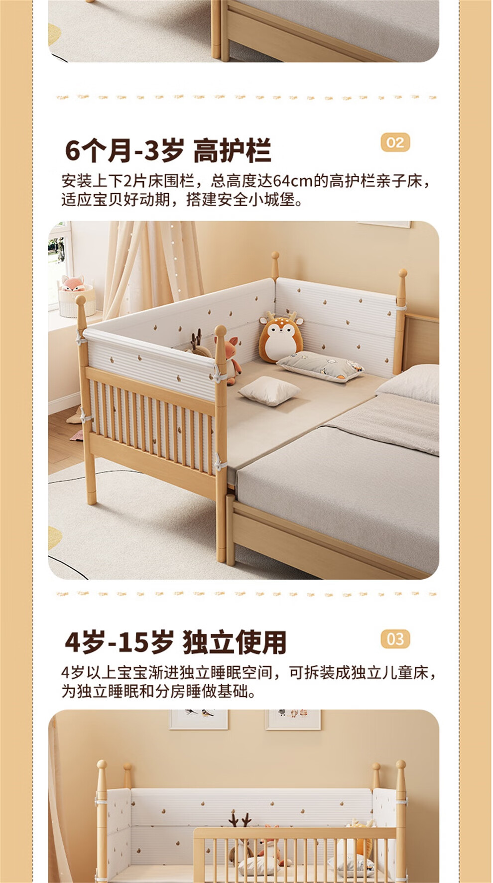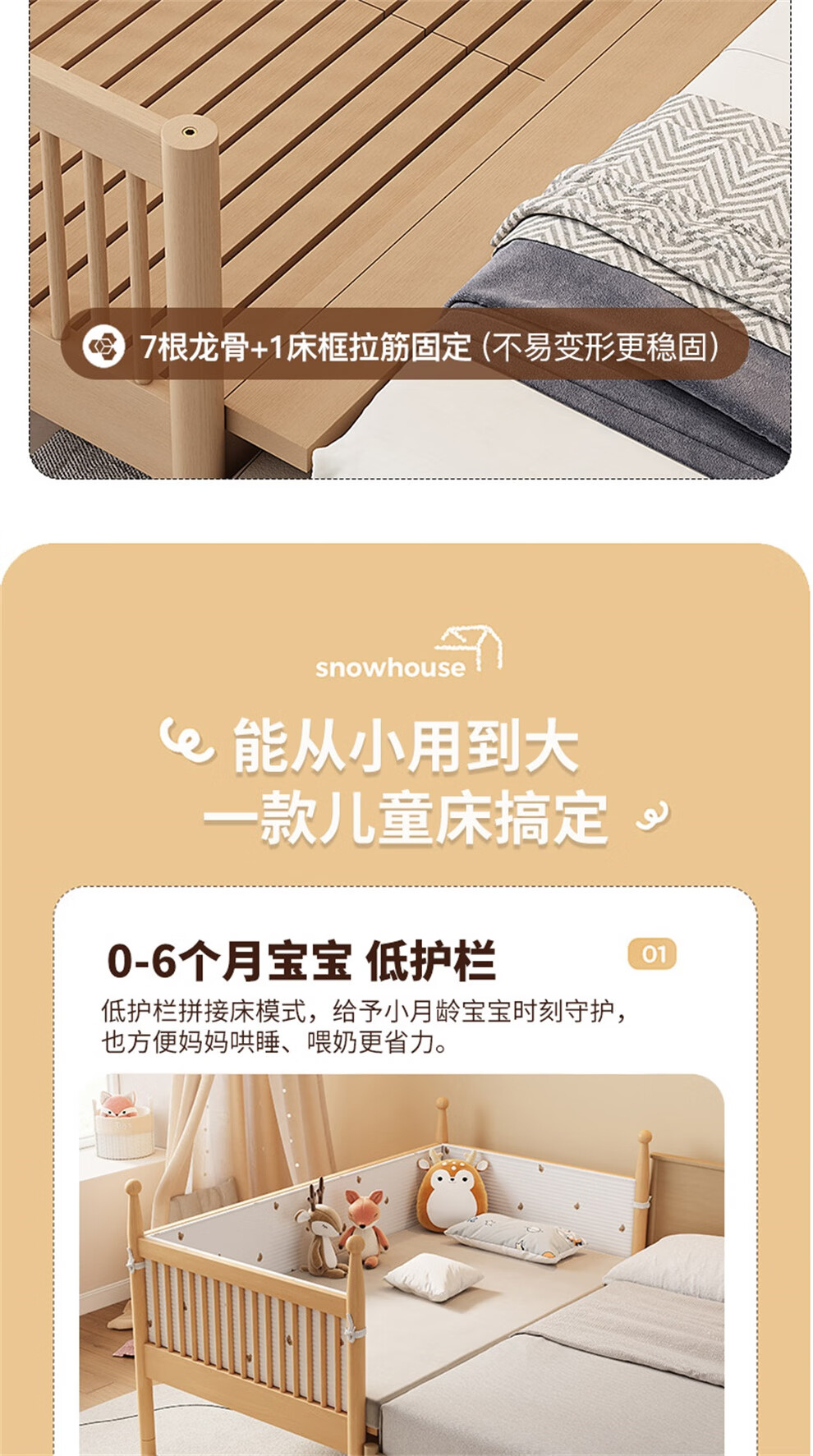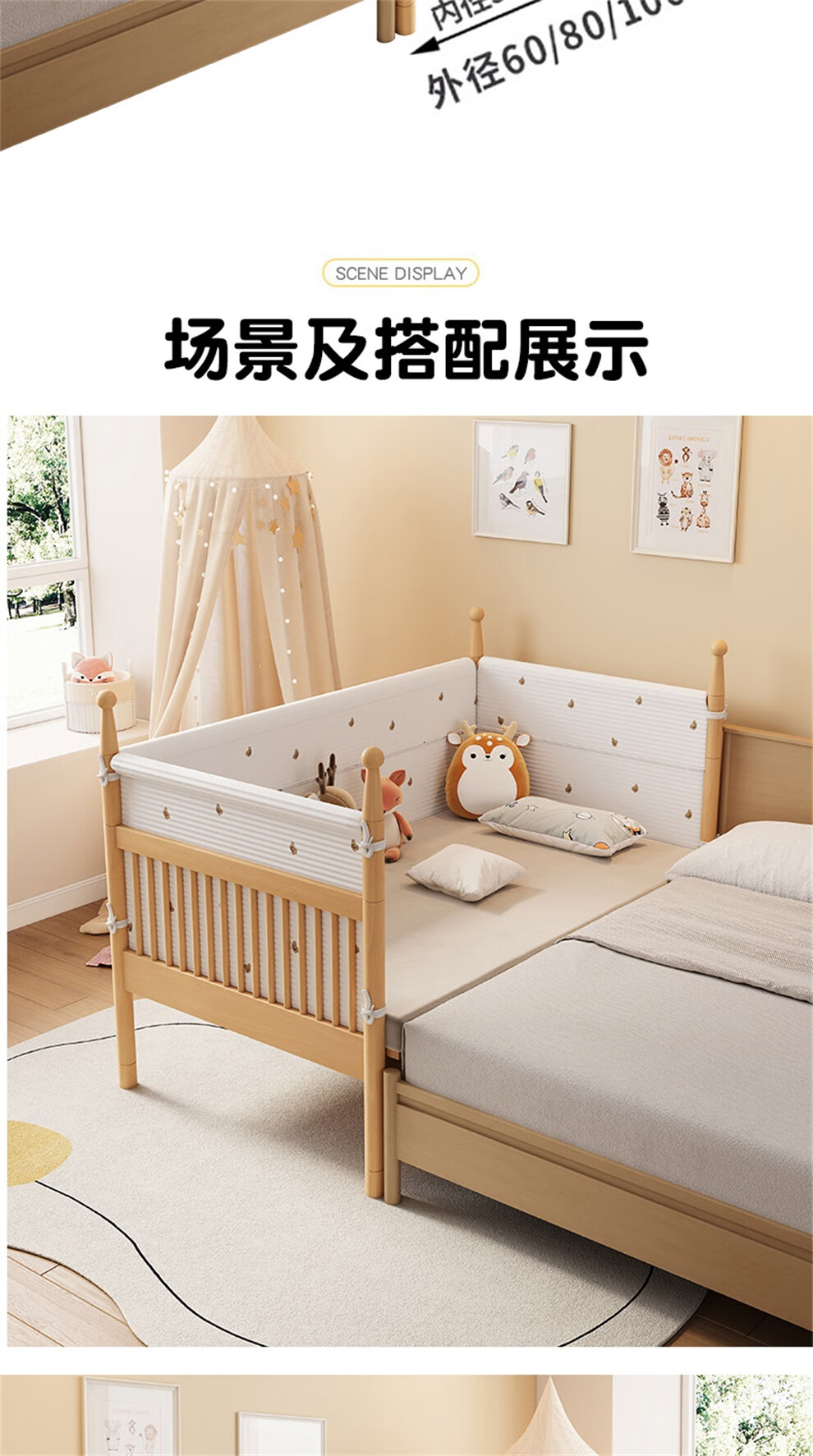 枫眠 儿童床拼接床婴儿床带护栏边床婴幼儿床男女孩床 进口榉木 床+小熊床围+5cm椰棕床垫 180cm*60cm(外径)