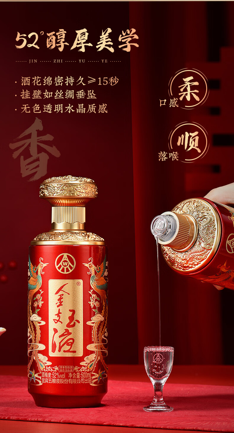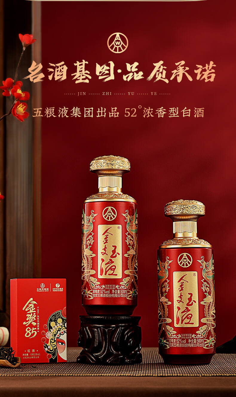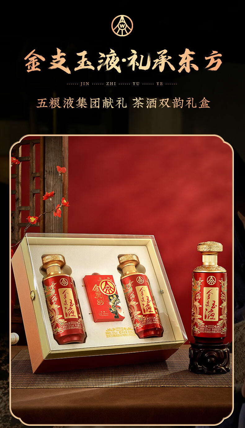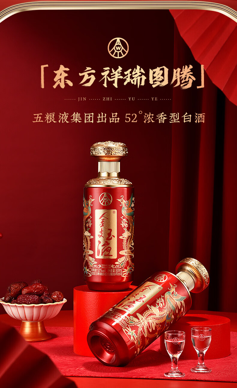 五粮浓香百鸟朝凤 金支玉液礼盒装 春节送礼浓香型白酒 52度 500mL 2瓶 礼盒搭配送礼手提袋