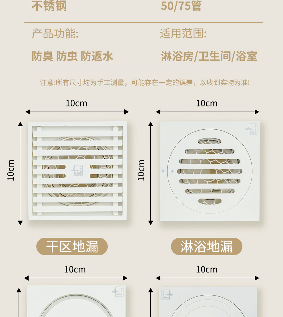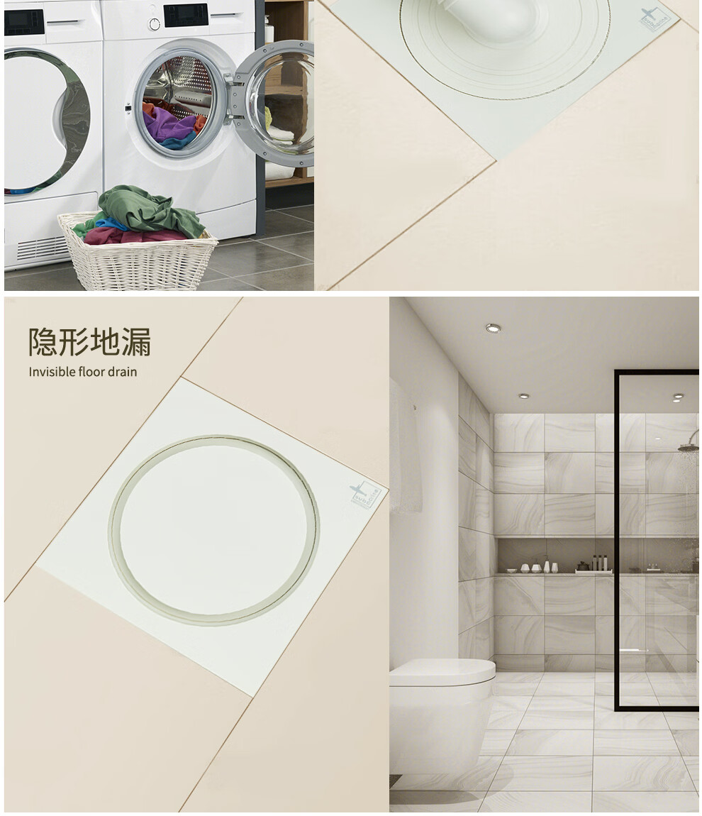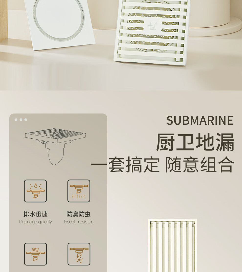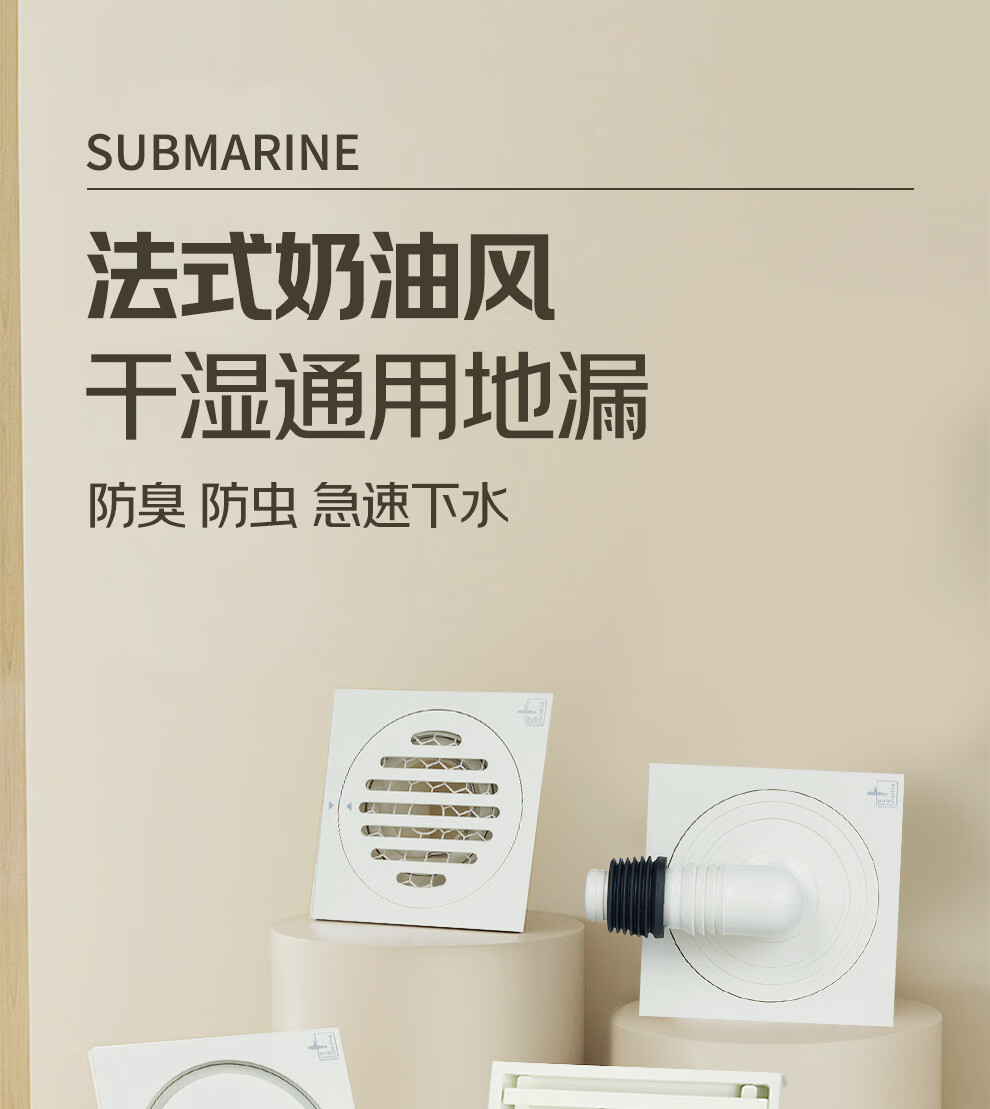 潜水艇不锈钢地漏奶油风防臭防虫卫生间淋浴厨阳台洗衣机铜地漏简约白 WTF50-10干湿区通用地漏