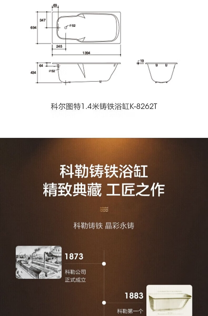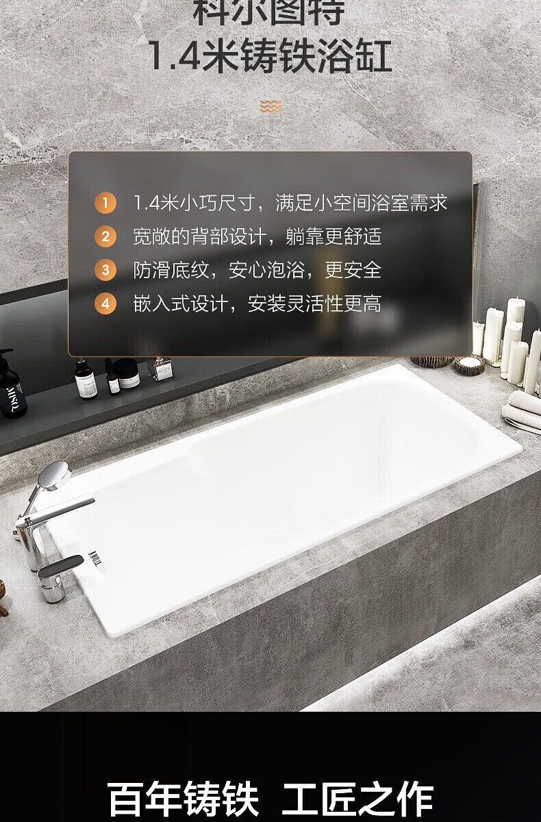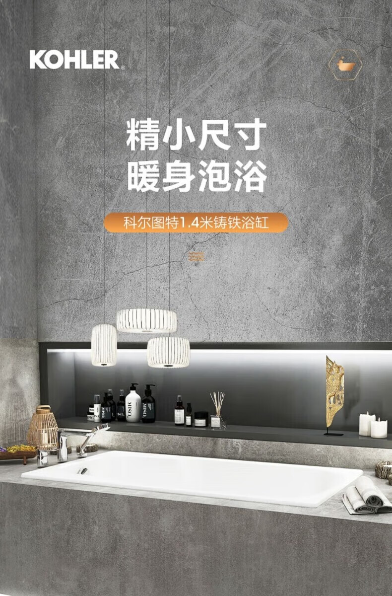 科勒(KOHLER)浴缸嵌入式家用成人浴缸科尔图特小户型1.4米铸铁浴缸 K-8262T-0
