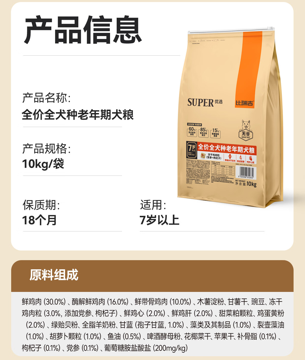 比瑞吉狗粮老年犬全犬种金毛泰迪优选系列草本冻干维D通用粮10kg7岁以上