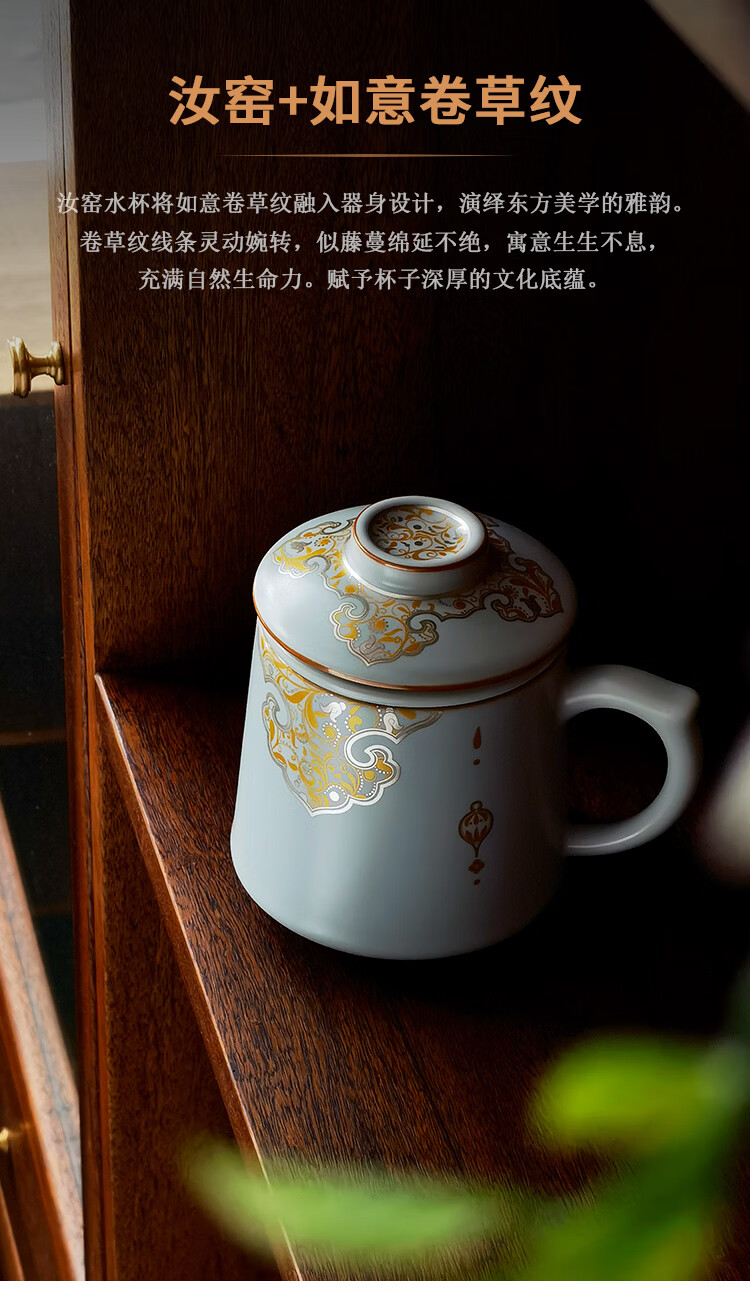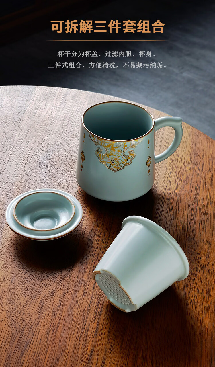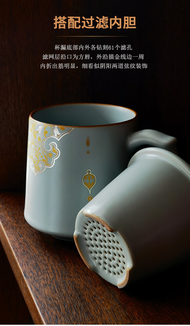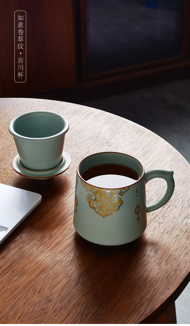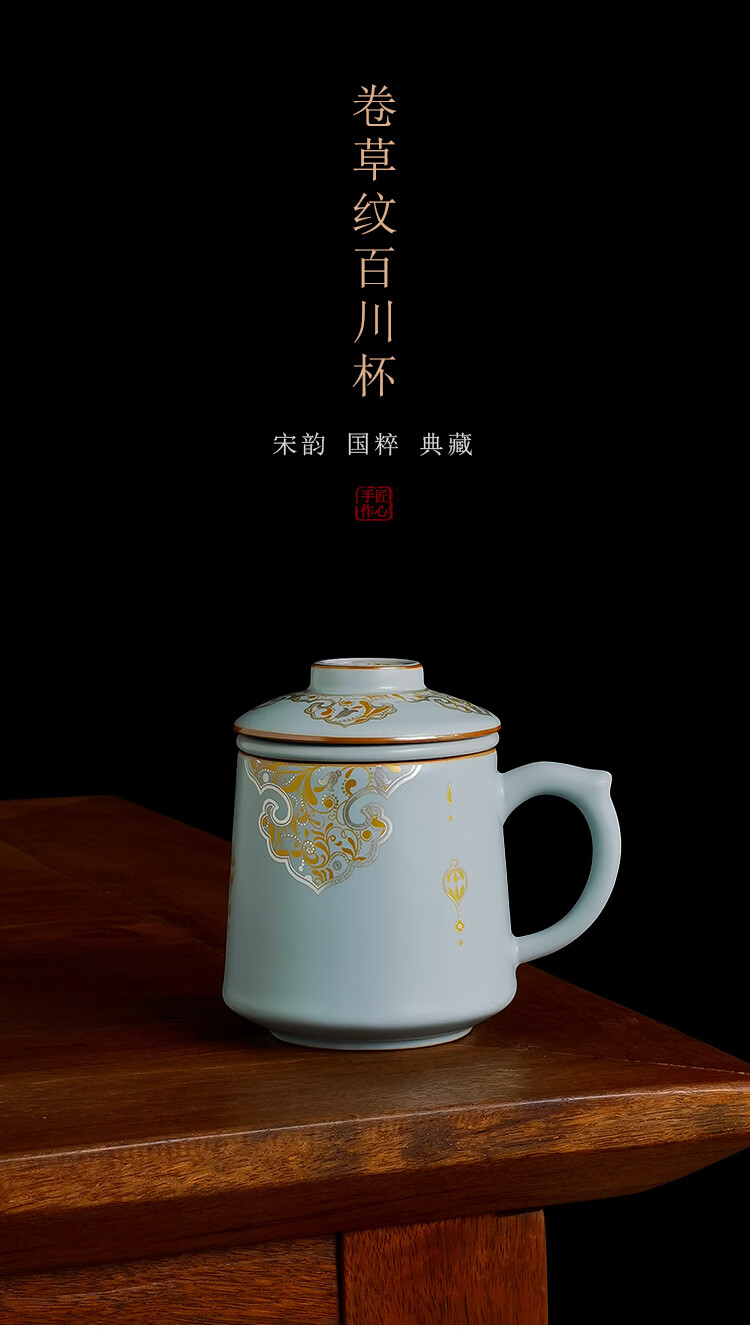 青禾窑汝窑马克杯高档陶瓷茶杯带盖过滤内胆茶水分离泡茶杯办公室喝茶杯 天青汝窑如意卷草纹(百川杯)