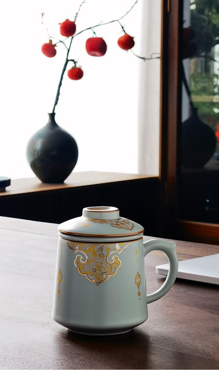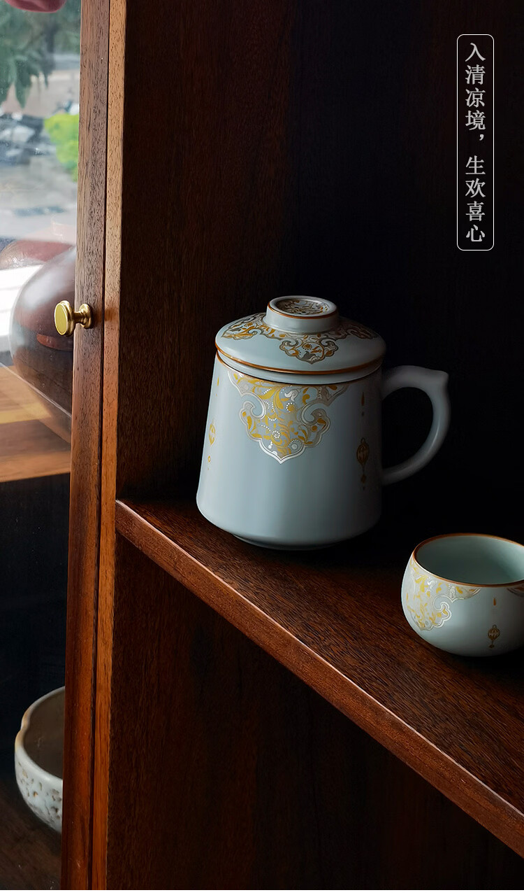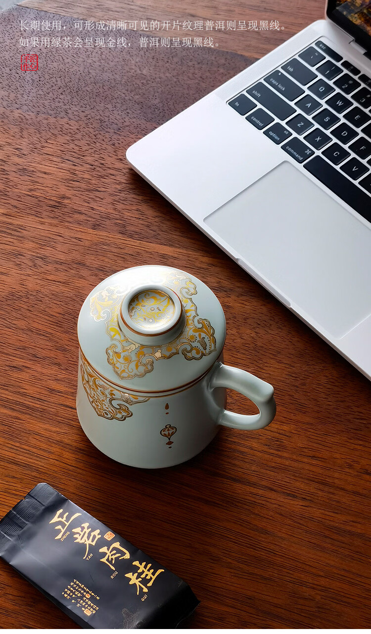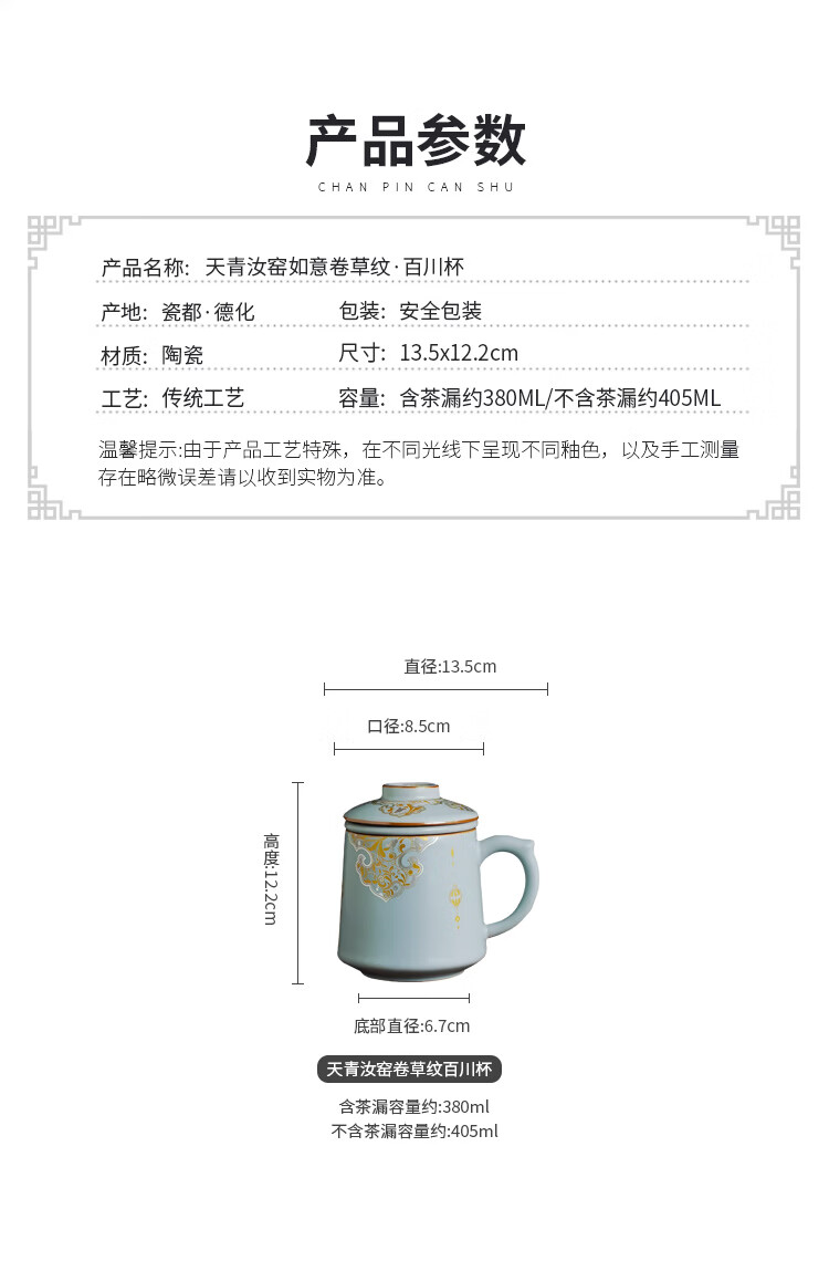 青禾窑汝窑马克杯高档陶瓷茶杯带盖过滤内胆茶水分离泡茶杯办公室喝茶杯 天青汝窑如意卷草纹(百川杯)