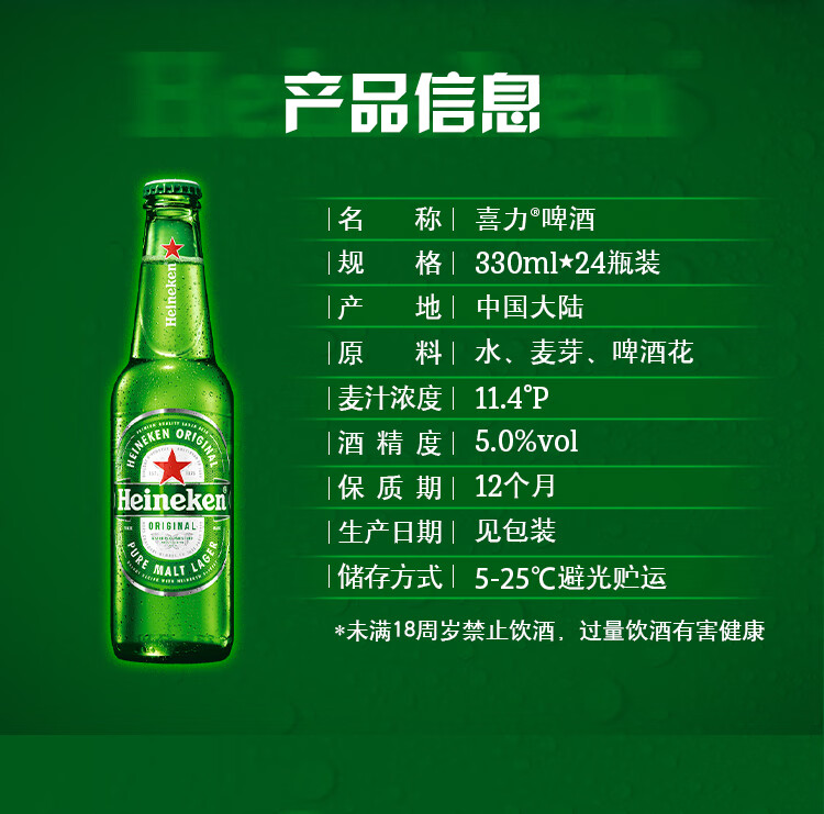 喜力经典330ml*24瓶整箱装 喜力啤酒Heineken 京东自营 新年送礼